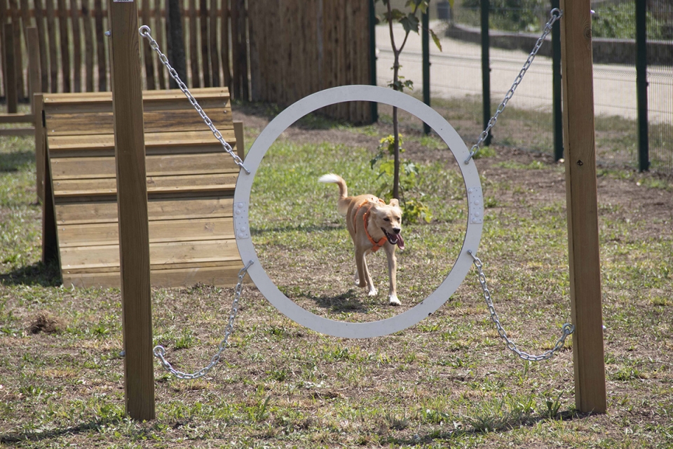 Para além de um conjunto de equipamentos recreativos – rampas, escadas, barreiras, mecos, túneis e abrigos – este espaço tem também duas caixas de areia, bem como bebedouros e dispensadores de sacos para recolha de dejetos.