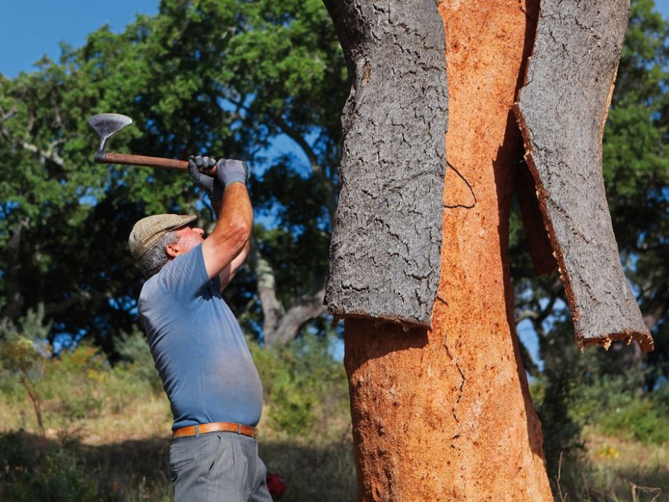 É no descasque que está o segredo desta atividade ancestral. Na arte de retirar a casca sem ferir a árvore, de modo a que esta continue a produzir, porque, está visto, os sobreiros são árvores caprichosas. «Os cortes têm de ser verticais, para soltar a cortiça em grandes blocos, que depois são empurrados com o cabo do machado», explica Eduardo. Nesta herdade são produzidas cerca de 2500 arrobas por ano, qualquer coisa como 37 toneladas.