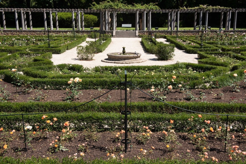 Foram eliminadas todas as velhas roseiras, menos duas: na pérgula, podem ver-se duas antigas e vigorosas roseiras com valor histórico. Uma delas é uma roseira Bela Portuguesa, variedade criada nos anos 1920, tendo este espécime perto de 100 anos; a outra é uma roseira de Santa Teresinha, uma variedade tradicional e muito cultivada nos jardins portugueses. “Os jardineiros não nos deixaram arrancar essas”, brincou Gerald Luckhurst.