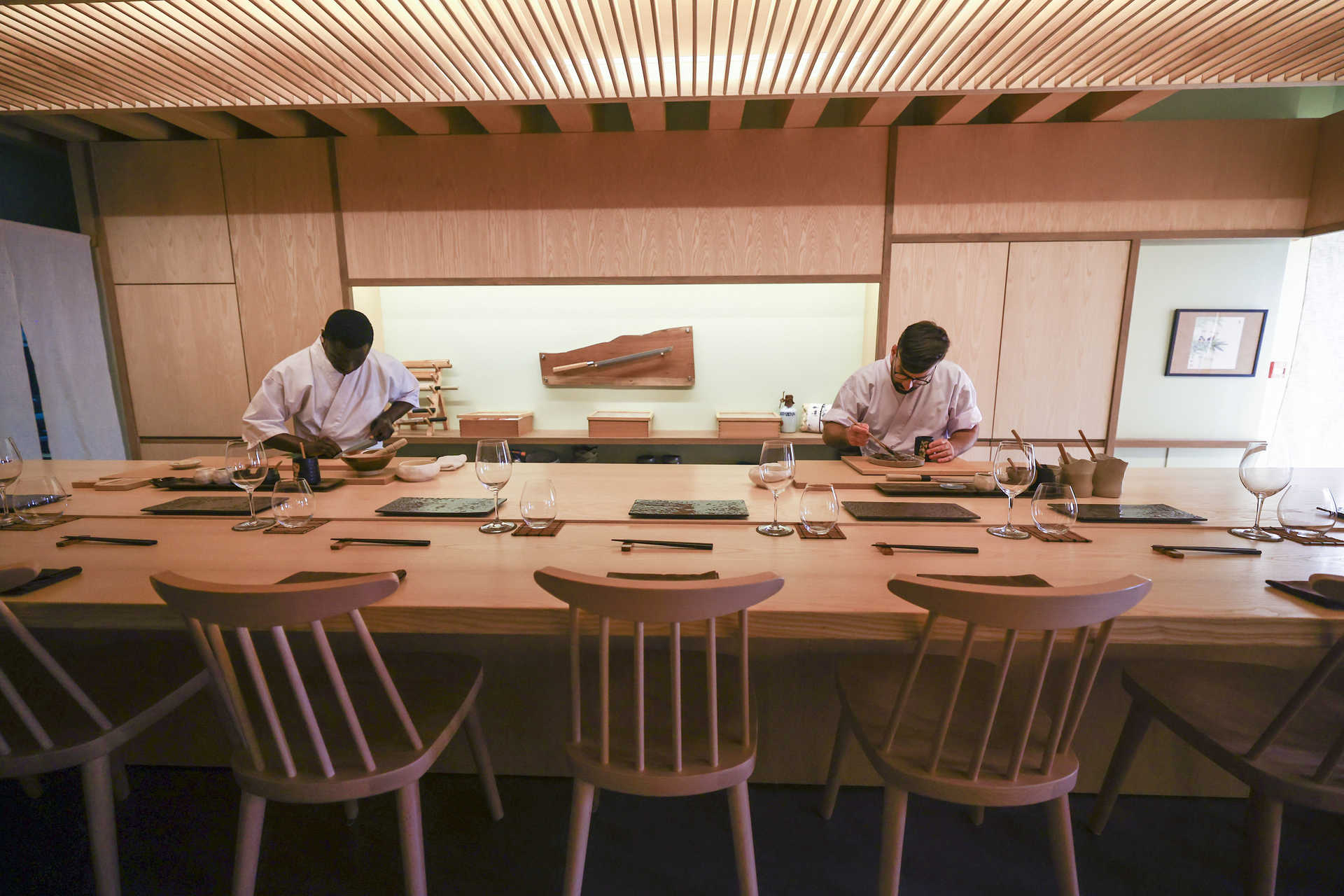 Na nossa visita, a sopa miso com berbigão da ria arrancou o menu, que se divide em três partes – entradas, secção de nigiris e sobremesa. O desfile organizado de sabores e técnicas japonesas avançou com ostras e molho ponzu; peixe-aranha com lima e flor de sal; lírio de Sagres finalizado com soja, wasabi fresco e ameixa seca; gamba da costa de Vila Real de Santo António com soja e ovas de tamboril; e pargo selado na grelha com fígado de tamboril cozinhado em saké. Os nigiri seguem-se, usando arroz japonês e proteínas como lírio, bica, pregado e a sua barbatana braseados, akami, chutoro e toro no caso do atum, ou sardinha braseada com salada montanheira no topo. Para o final, a sobremesa que junta suspiro, mousse de chocolate e quinoa crocante.