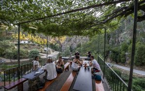 A entrada faz-se por uma esplanada coberta pelas folhas de uma enorme figueira, mas é depois de atravessar a sala principal e chegar a um varandim com apenas três mesas ...