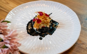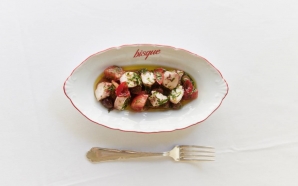 A cortina de veludo encarnado dá um enquadramento teatral ao balcão saliente da cozinha do Bisque, enquanto os cozinheiros se desdobram nas confeções e empratamentos ancorados no homónimo molho francês, ...