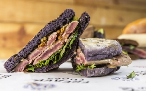 De Portugal, o “freaky” de bife de atum fresco selado na chapa com puré de abacate, salada, tomate e maionese de coentros servido em bolo do caco de alfarroba com ...