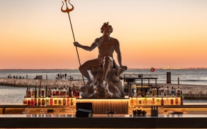 Sentado num rochedo enquanto empunha o seu tridente, Poseidon, o deus do mar na mitologia grega, vigia atentamente o bar em mármore, no centro do deck exterior em madeira, pintado ...