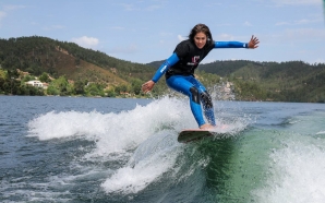Vestida com fato de neoprene e uma t-shirt da WAKE WITH GIRLS, Rute Marta equilibra-se na prancha de wakeboard, fletindo as pernas enquanto agarra com uma mão o cabo preso ...