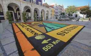 Mil e cem quilos de sal, 500 litros de serradura e 750 litros de terra foram utilizados para construir um tapete efémero no chão da Praça de Bocage, em frente ...