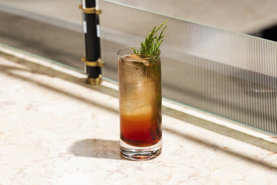 O espaço é amplo e luminoso, com tetos altos e janelas largas, e uma decoração cosmopolita onde não falta a pedra de lioz e as madeiras escurecidas. Ao final da tarde e noite fora, a mixologia ganha vida à mesa ou ao balcão, somando-se quase 40 lugares entre as duas dinâmicas. Na carta, reinam 18 cocktails a partir dos oito euros – a grande maioria de autor, além de três clássicos – pensados pelo bartender Tiago Santos, que rodam a ritmo constante. “É um menu vivo, aberto à criatividade e inovação. Para a semana, já pode ser diferente”, conta o responsável de bar, que incorpora nas bebidas ingredientes de origem ou presença nacional, como o eucalipto, hortelã-da-ribeira, tangerina ou cedro.