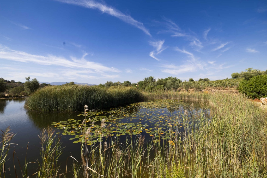 As vinhas dispõem-se em quatro hectares em colina – apenas um de castas brancas – e vivem em solos calcários cobertos pelo arenito avermelhado do grés de Silves, rodeadas de oliveiras e pomares. Entre os vários tipos de visita, o mais sensorial é aquele que inclui um passeio pelo jardim botânico com mais de 110 especiarias de todo o mundo e árvores de frutos, 40 delas de citrinos. Lima-caviar australiana, pimenta-rosa do Perú, figo-da-Índia, banana da Madeira, limão do Brasil, diospiro-negro do México e ameixa da África do Sul conferem cor e perfume ao lugar.