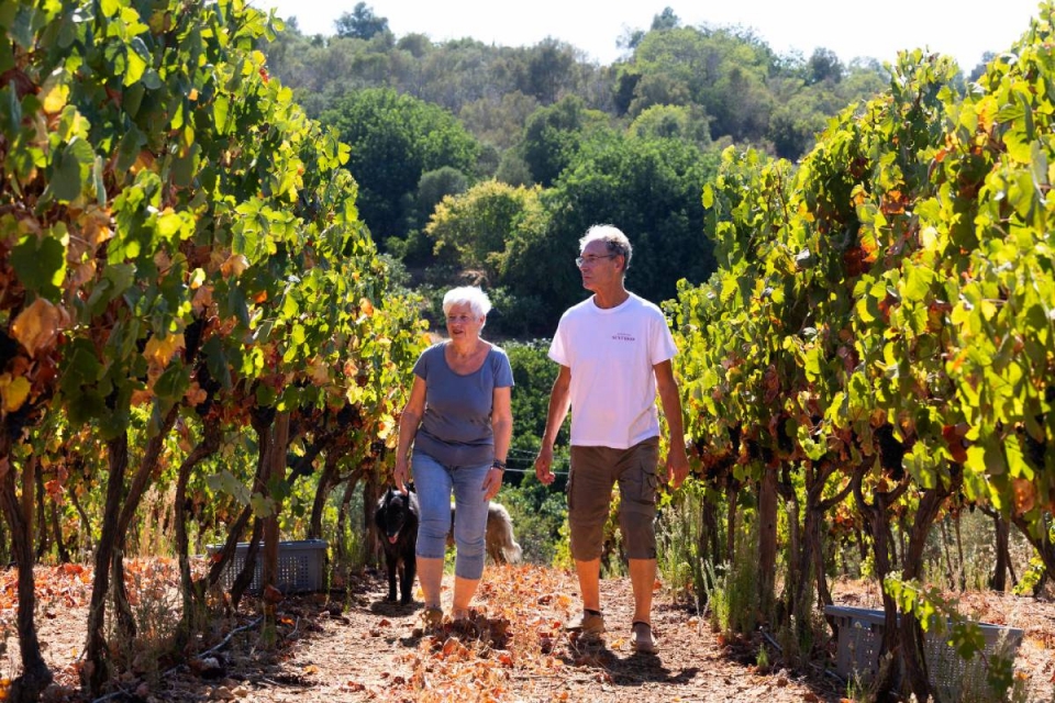 Os dois alegres pastores-belgas Shira e Saiko apressam-se a ir cumprimentar, curiosos, quem entra na Quinta dos Sentidos para visitar a adega. Os animais são a companhia diária de Beat Buchmann, de 69 anos, natural de Zurique, e Charlotte Toubro, 72, dinamarquesa, pelo menos desde que deixaram para trás o cinzentismo da banca suíça em busca de “um lugar ao sol” no sul de Portugal. Sem saber onde nem o que procurar, depararam-se com nove hectares de um terreno abandonado há décadas, cujas ruínas e mato alto não faziam adivinhar o seu potencial.