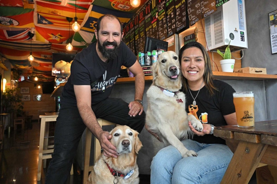 Em apenas cinco meses, montaram em Matosinhos o HopTrip, que cumpriu cinco anos em festa no passado mês de julho. A cadela da dupla, Spuma, foi desde o primeiro momento um dos atrativos da casa. Recentemente, a família cresceu. “Ainda antes da pandemia, a minha esposa foi passear a Spuma; aí, um cão pulou do primeiro andar para o rés-do-chão”, conta Odair. Era um golden retriever, como a Spuma, e do caso nasceram seis cachorros. Ficaram com uma fêmea, a que chamaram Dublin. “Às vezes os irmãos estão por aqui, ficaram todos perto.”. Odair admite que as cadelas captam toda a atenção da clientela, que mais facilmente decoram os seus nomes do que o dos proprietários.