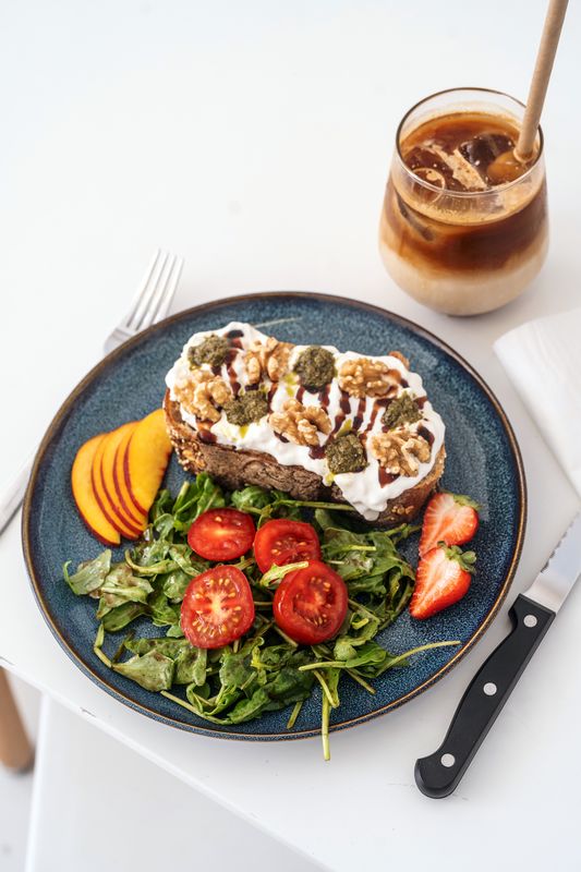 - Torrada de burrata e nozes e iced latte. (Fotografia de Maria João Gala)