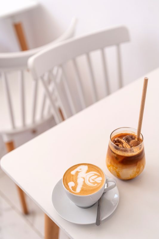 - Cappuccino pequeno (com cavalo marinho) e iced latte. (Fotografia de Maria João Gala)