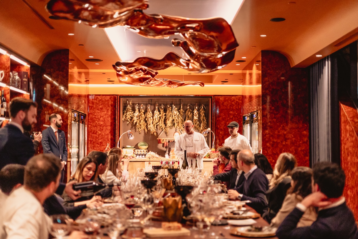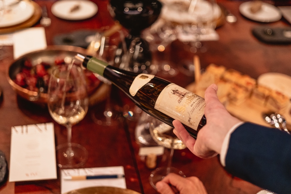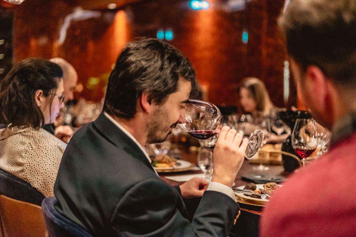 A regra é não haver muitas regras, deixando à consideração dos convidados o que apresentar e como o fazer. Neste caso, André Barbosa escolheu os vinhos da Soalheiro e Luís Cerdeira os da Poças. Antes do jantar, os convivas confraternizaram no bar do hotel. Um copo de espumante do Soalheiro Bruto Barrica 2018 e o vermute da Poças Soberbo deram início às primeiras trocas de palavras, que continuaram depois na Sala dos Trinta, um espaço que respira vinho, dominado por uma grande mesa comum.
