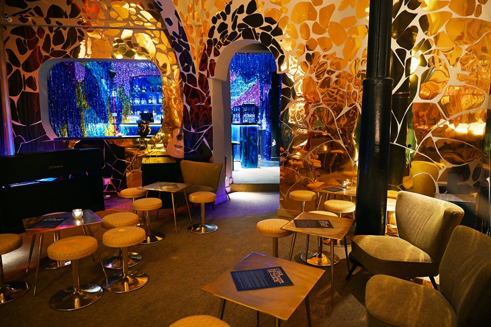 A ideia de Camila Prado Fonseca, proprietária, já vem dos tempos d’O Bom, O Mau e O Vilão (clássico do Cais do Sodré), e agora concretiza-se em Santos, a paredes-meias com os seus restantes projetos, o Flat e o Lulu, Um Pub Bonito. “Este é um bar onde podemos estar como somos, sem pressão para estarmos felizes. Se estivermos tristes, podemos abraçar essa tristeza, mas não é algo forçado”, conta Raquel Azedo, gerente. Com lugar para 40 a 50 pessoas, o bar intimista divide-se em duas zonas: uma primeira onde dominam dourados, espelhados, um piano, cortinas de veludo e uma bola de espelhos; e uma segunda, para beber à mesa ou ao balcão, mais garrida, com fitas coloridas a encher as paredes. Até porque depois da tristeza, “vêm os picos de euforia”, explica Raquel.