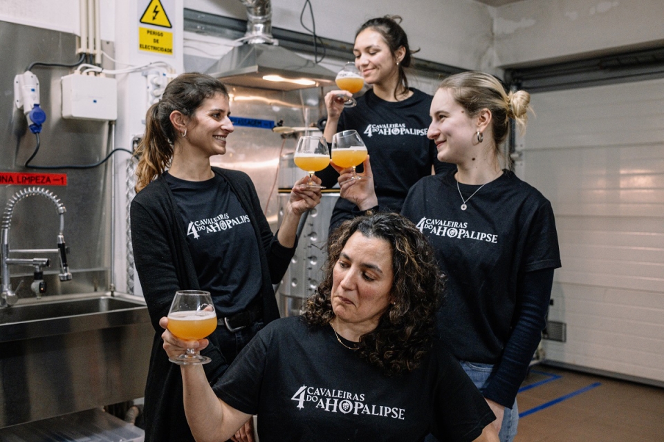 Quando se decidiram a fazer uma cerveja e pensar no estilo que queriam desenvolver, Rita lembrou-se de Raquel Magalhães. “Para trabalhar os aromas, ela era ideal”, diz. Cervejeira caseira, Raquel conheceu Rita nos encontros de homebrewers promovidos pelo pelo bar Catraio. Desde que foi à Bélgica, há 10 anos, que Raquel se começou a interessar pelo assunto. “Quando voltei a Portugal comecei à procura de espaços de cerveja e foi quando abriu o Catraio”, lembra. Sugeriu ao namorado que começassem a produzir e embarcaram nessa empreitada em 2019. Pouco tempo depois, arrancaram os tais encontros de cervejeiros caseiros e formou-se um grupo para troca de experiências e aprendizagem. Assim conheceu Rita e Franco. “Entretanto, separei-me do namorado e ‘reformei-me’ do mundo cervejeiro, mas a Rita foi-me buscar-me para fazer parte desta aventura”, conta. Eram, então, já quatro, e Rita lembrou-se: “olha, somos as quatro cavaleiras do apocalipse” e logo transformaram o “apocalipse” em ahopalipse [trocadilho com “hop”, lúpulo, em inglês].