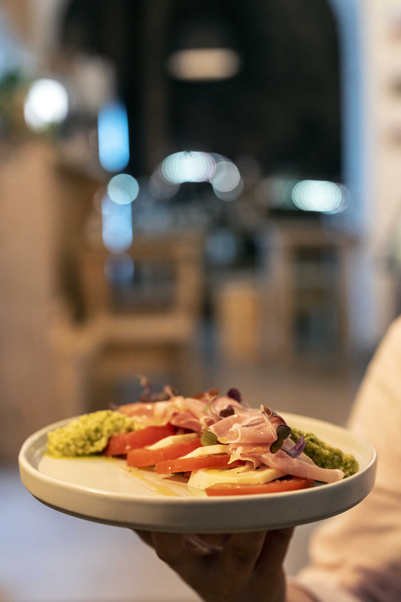 - Tomate, queijo Rabaçal, pesto de tremoço e presunto. À direita, Maria Rebelo. (Fotografias de Maria João Gala/GI)