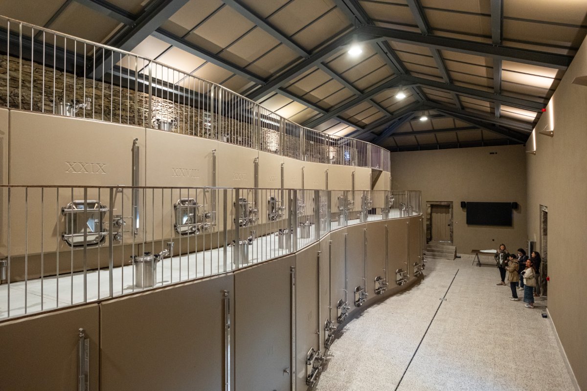 Quando se entra, há um bloco que se estende entre as paredes da adega e onde se encontram as novas 32 cubas de cimento, todas de diferentes tamanhos, o que permite fazer oxigenações distintas. “É uma instalação única no mundo, feita por uma empresa italiana”, idealizada e desenhada pela diretora executiva da empresa, Luísa Amorim. O corredor por onde se acede à parte de cima das pipas de cimento retrata a silhueta da Quinta Nova ao longo do rio. É o serpentear do Douro que ali se vê, junto com uma alusão aos patamares de vinha.