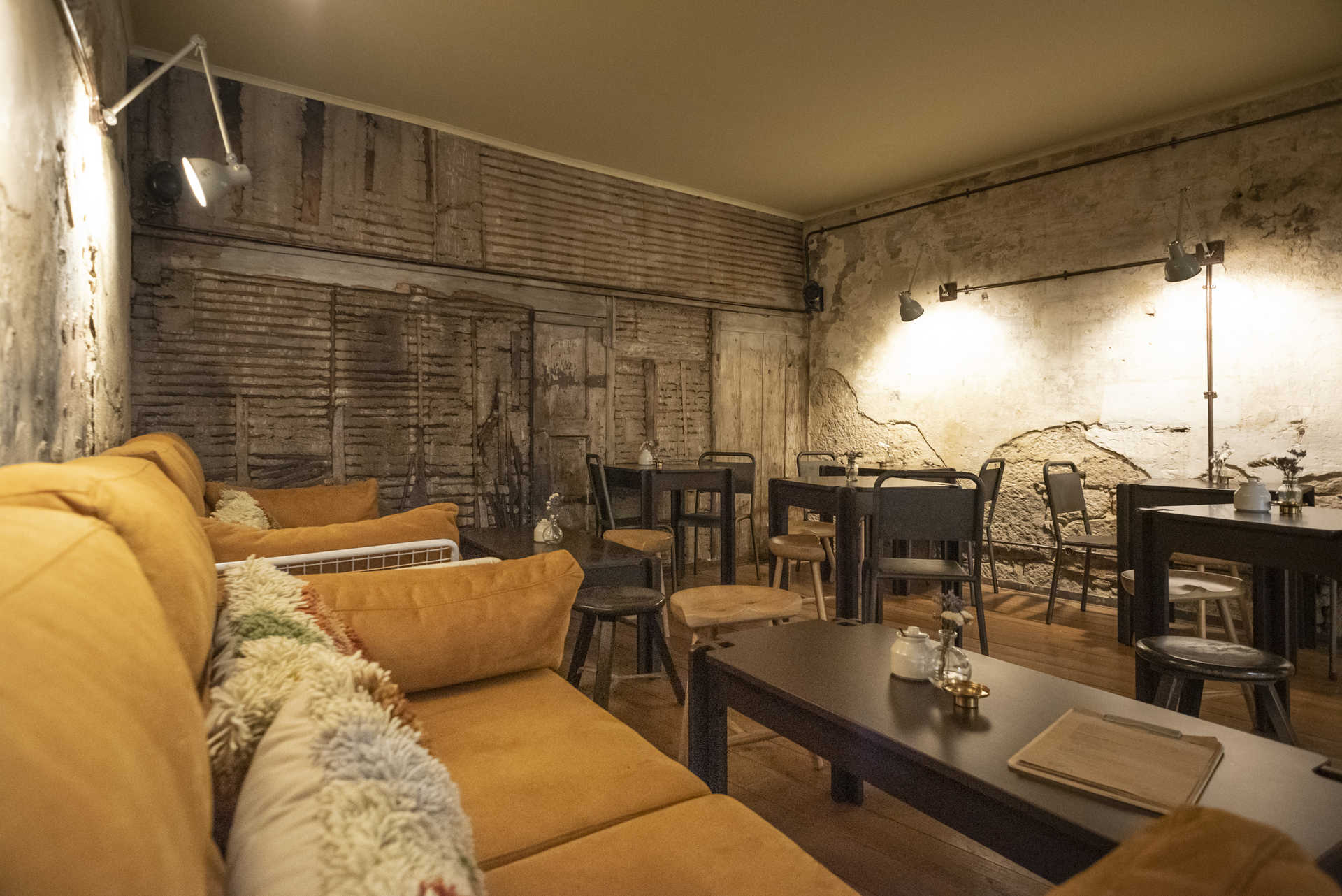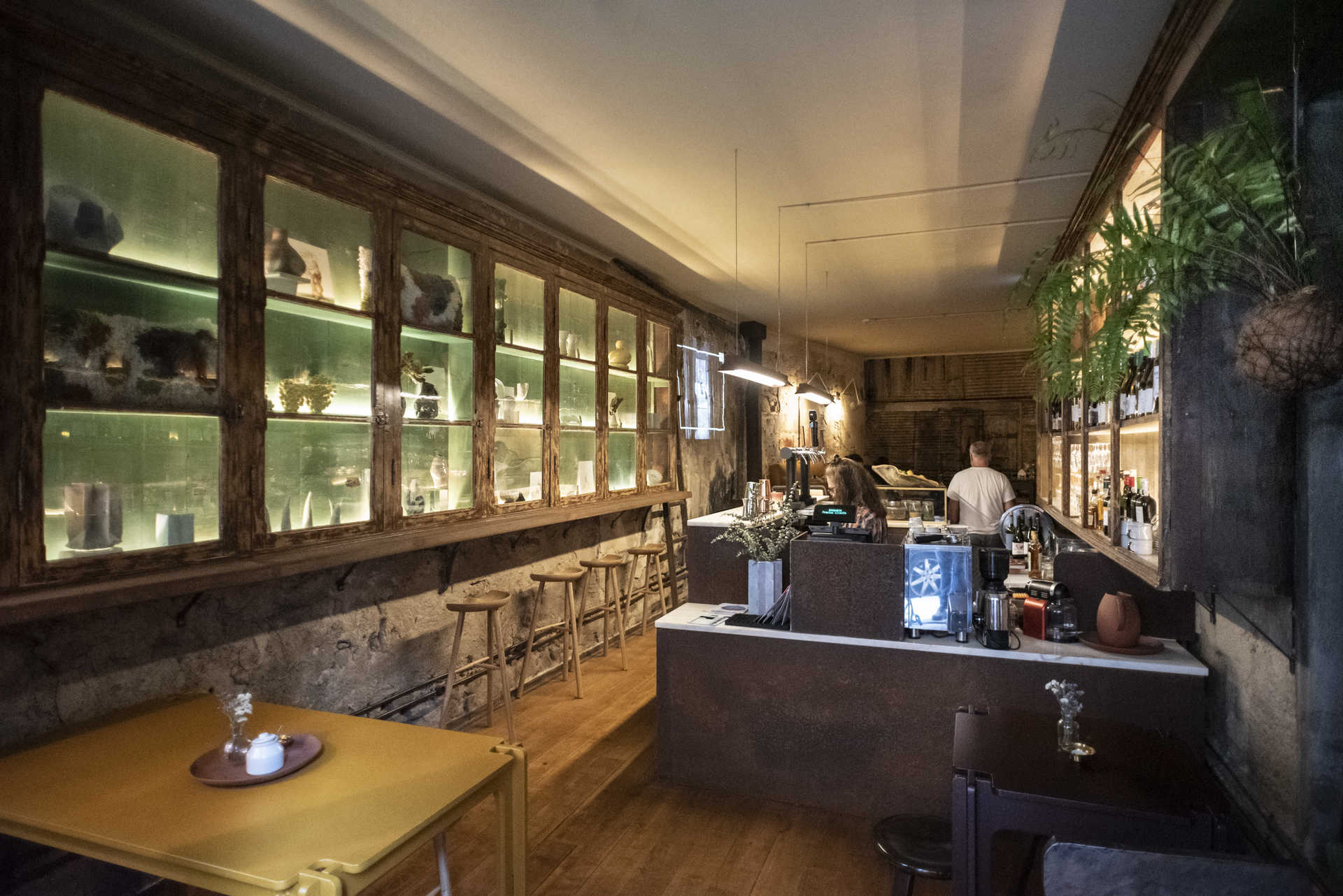 Quando a drogaria fechou, os dois amigos não pensaram duas vezes e lançaram-se no projeto, sempre com a intenção de manter viva a memória daquele espaço. Designers de profissão, não pouparam nos detalhes da transformação do espaço, que esteve em obras durante um ano. “Quisemos respeitar aquilo que encontramos, descascar as paredes todas até encontrar toda a história do lugar, queríamos tudo puro e duro”, explica Maria. Por isso, não é de admirar ao ver a parede de fundo em tabique. Noutras, sobressai a pedra crua, os tubos da antiga canalização a descoberto, a ferrugem. E o soalho, ainda que não seja original, mantém o espírito de autenticidade.