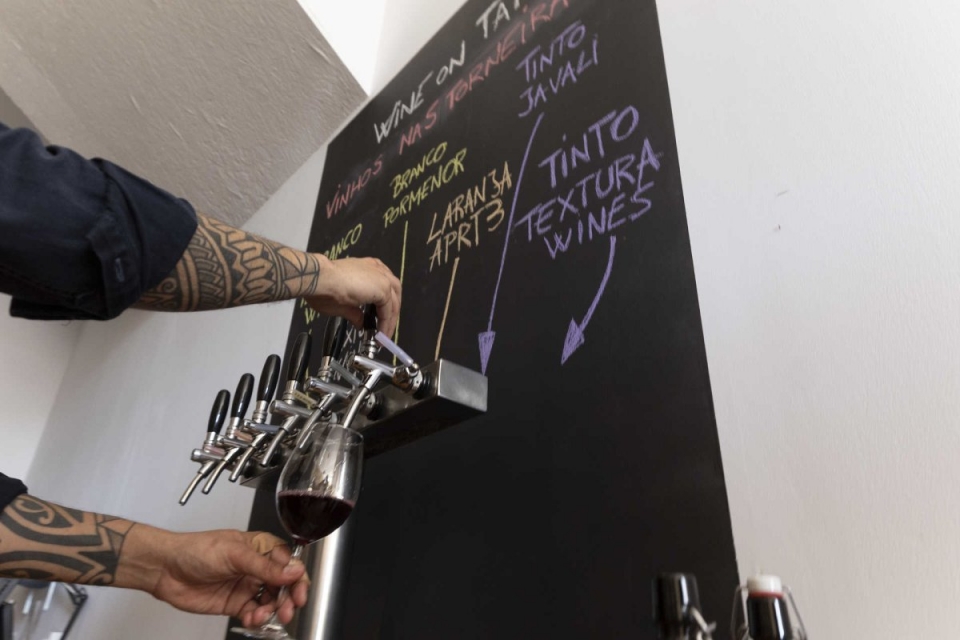 Das torneiras saem seis vinhos de quatro pequenos produtores: Textura (Dão), APRT3 (Lisboa), Javali (Douro) e Pormenor (Douro). Todos eles têm em comum serem vinhos de pouca intervenção e lotes que os produtores não têm em garrafa, por isso, só se podem beber aqui. Há dois brancos, dois tintos, um rosé e um laranja.