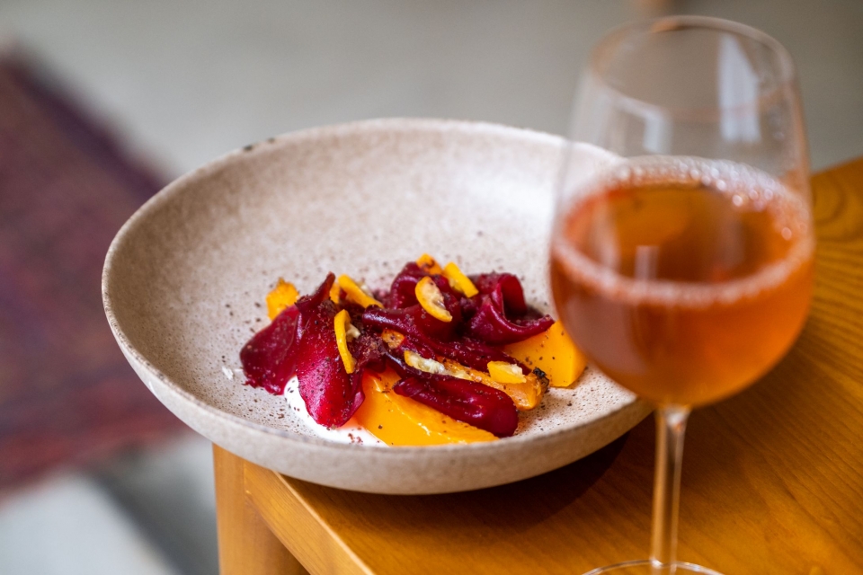 Ali, dá-se a conhecer o trabalho de pequenos produtores portugueses, do Douro, do Dão, da Região dos Vinhos Verdes, da Beira Litoral e de Lisboa, acompanhados pelas criações sofisticadas mas descontraídas do chef Tiago, que dá preferência aos produtos da época, confecionados de maneira criativa, como o prato que estava a sair no dia visita, e que juntava abóbora, cenoura, beterraba e escabeche de coco.
