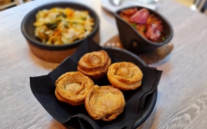Croquetes de novilho com maionese de mostarda, tacos de tártaro de novilho com lima e tougarashi, txistorra (linguiça basca) grelhada no josper com tostas, e carpaccio de entrecôte trufado com ...