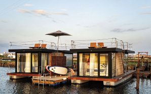 É um alojamento flutuante, ainda que o movimento seja quase impercetível. Mas é também mais do que isso. Depois de atravessar o canal para a Marinha Passagem – dois minutos ...