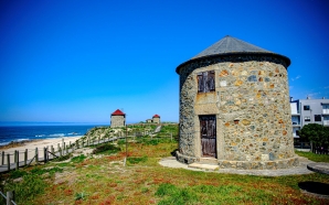 Um estreito e longo areal, protegido da nortada por um cordão dunar coroado com moinhos de vento ligados por passadiços de madeira; barcos de pesca coloridos e uma marginal corrida ...