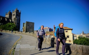 Helene e Margot saem a passo firme da catedral. De mochila azul às costas e bastão em punho, roupa desportiva e a vieira, qual divisa do peregrino, pendurada à ré. ...
