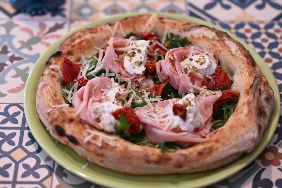 Essa sabedoria colhida ao longo do tempo põe agora em prática na Il Piacere, onde optou por fazer pizas com empaste do tipo napolitano. Cobre-as com presunto de Parma, burrata e Parmigiano-Reggiano, no caso da piza Sicília, ou ricota de búfala, mortadela de pistácio, mozarela flor de leite, tomate semiseco, porcini e pistácio, na Campeone 2018. Há também pastas, risotos, saladas e um conjunto de entradas, como a deliciosa bruschetta com mozarela de búfala, tomate semiseco, pesto e manjericão ou a da casa, a Il Piacere, com presunto de Parma, pesto e burrata.