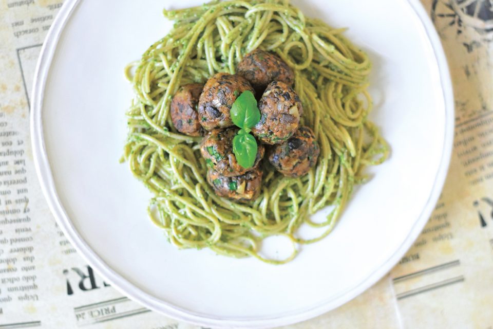 ALMÔNDEGAS DE COGUMELOS COM MASSA AO PESTO