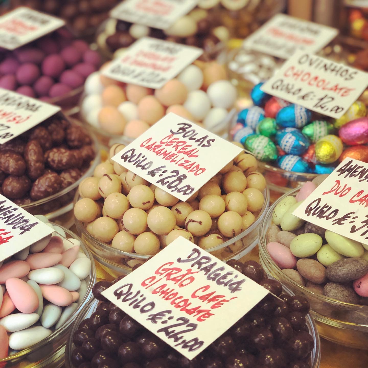 Há um arco-íris de amêndoas de Páscoa n’A Favorita do Bolhão. A octogenária mercearia, localizada na Rua Fernandes Tomás, recebe todos os anos uma grande variedades de amêndoas, sendo que este é possível pedi-las para casa.
