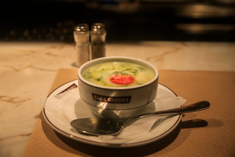 No novo espaço da Casa Guedes, a uns metros do original, não há mãos a medir para atender a clientela que não para de entrar para comer os clássicos da casa. Entre eles, está o caldo verde – uma das três sopas do cardápio, a par das papas de sarrabulho e da sopa de legumes. A receita, como das restantes, é a mesma da casa-mãe, garante César Correia, que no novo espaço continua a tratar do pernil para as famosas sandes. Couve galega, batata, a chouriça e o azeite são os ingredientes principais. E há um elemento secreto que César não revela. “Está lá mas não se vê”, garante. A sopa é servida em tigela e, uma novidade, também em copo. Quando os clientes se sentam, um funcionário vai à mesa, com uma bandeja, onde estão vários copos e um jarro. Nos copos encontra-se a couve já cozida. Do jarro sai o creme de batata, que se serve à mesa, em frente do cliente.