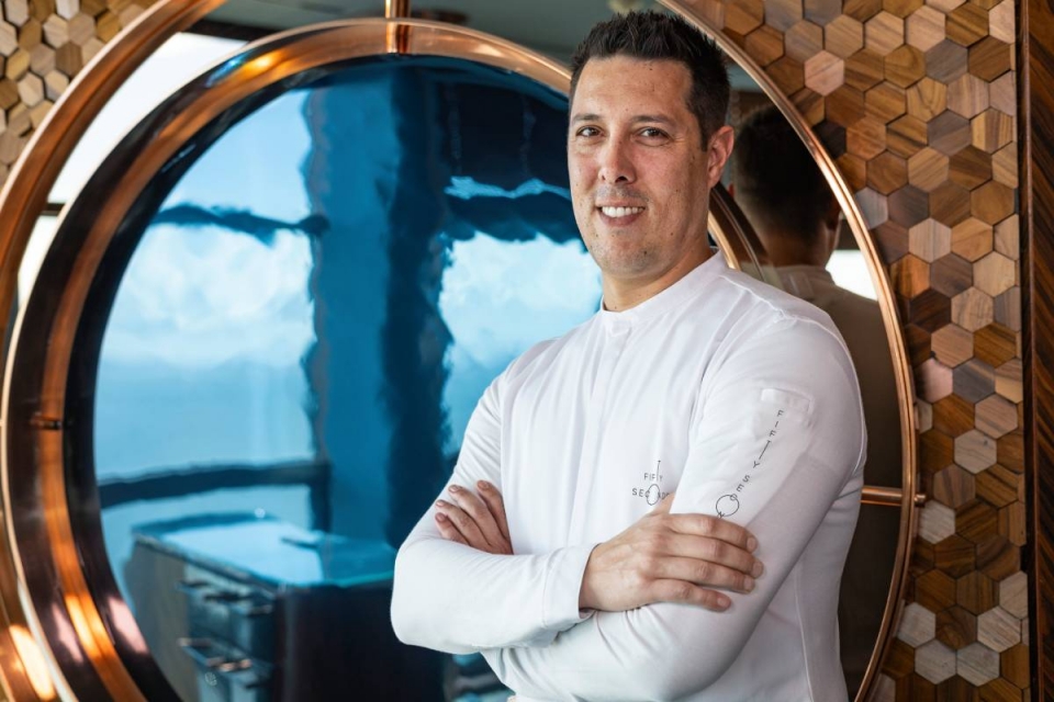 “O facto de estarmos no cimo da torre, a ver as torres São Gabriel e São Rafael [referentes às naus comandadas por Vasco da Gama e o irmão Paulo da Gama], assenta que nem uma luva ao trabalho que desenvolvemos aqui”, considera o chef Rui Silvestre, que em fevereiro assumiu publicamente o projeto após a saída de Martín Berasategui e Filipe Carvalho, no final de 2023. Quando chegou, esteve cerca de dez dias sozinho a tirar as medidas à sala envidraçada com 30 lugares e a estudar os diferentes ambientes, enquanto se inspirava no que via lá em baixo.