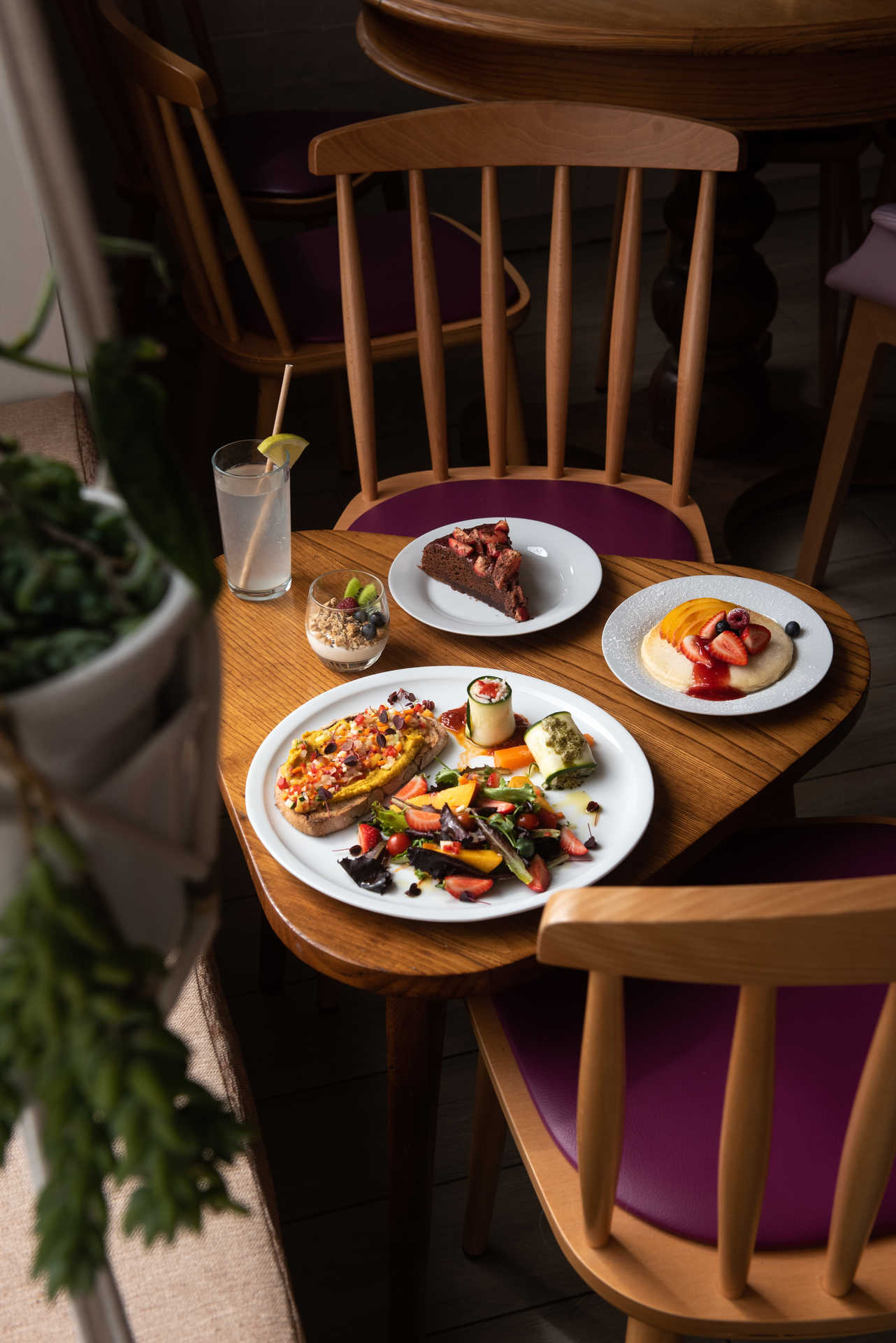 Nos fins de semana e feriados, das 11 às 16 horas, há três menus de brunch: vegetariano, vegano e baby, para crianças até 12 anos. O vegetariano é composto por iogurte com granola caseira, panqueca com fruta e compota, prato quente (diferente a cada semana), bebida (água aromatizada, limonada ou chá, em dose ilimitada), café e mini fatia de bolo. No vegano muda o prato, as panquecas são de banana e o iogurte cede lugar à aveia adormecida com frutos secos e fruta fresca. Já o baby brunch engloba panquecas com compotas, fruta, ovos mexidos, sumo do dia e mini fatia de bolo, podendo acrescer a tudo isso sopa.