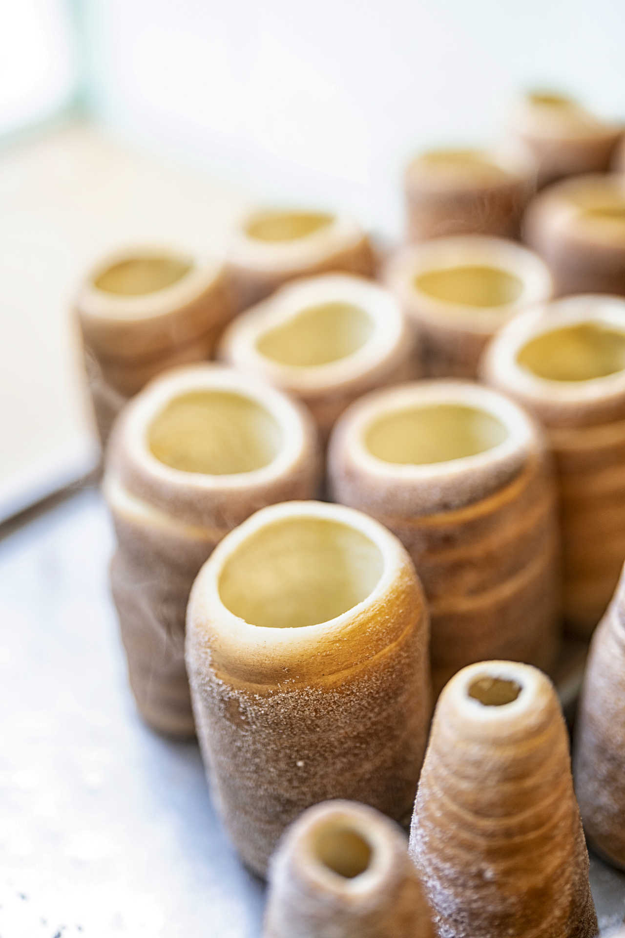 O bolo chaminé tem forma de cilindro (ou cone, caso leve gelado) e é oco. “A massa é feita aqui, ao longo do dia”, num processo que acontece à vista de quem entra e termina no forno, explica Rui. Num primeiro contacto, a preparação gera alguma curiosidade, assim como o produto final, que se vai desenrolando qual serpentina. Ao mais tradicional, com açúcar e canela, juntam-se várias adaptações. Escolhe-se diferentes sabores e texturas, recheios que vão dos fios de ovos aos brigadeiros.