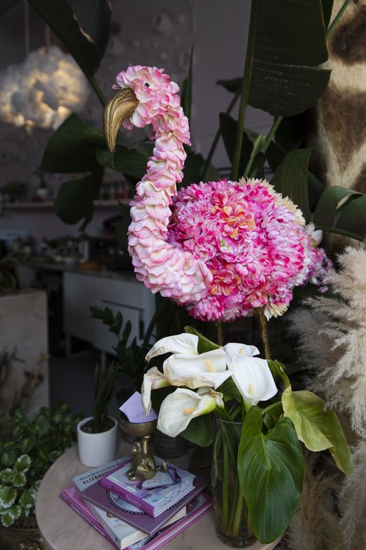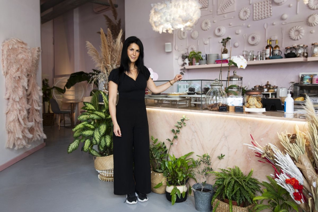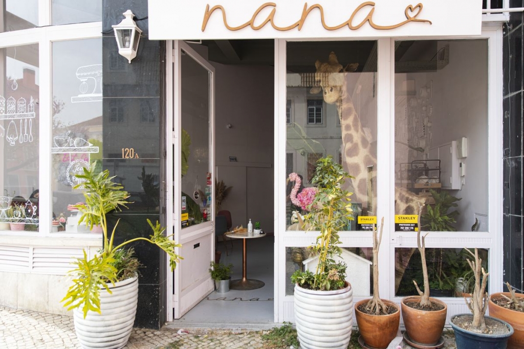 O pescoço de uma girafa atrai a atenção de quem passa na rua, e quem se aproxima da porta da Nana – O Ponto Mais Doce da Cidade dá de caras com um flamingo rosa no meio de plantas exuberantes. O que se vê lá dentro podia ser cenário de uma fantasia, pois há candeeiros forrados a nuvens, espelhos, formas de pastelaria na parede, um neon a dizer “Eat cake, pray, love”, almofadas de padrões coloridos e asas de anjo na parede.