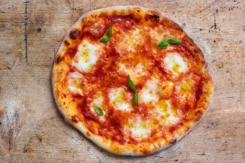 untada com azeite. Cobrir com um pano de cozinha humedecido e deixar levedar durante uma hora. Para o molho, descascar os alhos, cortá-los em rodelas e colocá-los numa frigideira com azeite. Deixar alourar. Adicionar o tomate e metade das folhas de manjericão, e deixar cozinhar por cinco minutos. Provar, retificar temperos, deixar arrefecer e triturar num liquidificador até o molho estar macio. Quando a massa tiver dobrado o volume, amassá-la de novo e dividi-la em oito bolas. Deixá-las levedar por 30 minutos num tabuleiro coberto com um pano e polvilhado com farinha. Quando chegar a hora de fazer as pizas, ir esticando e puxando a massa com as mãos, estendendo as pizas uma a uma, passando-as de uma mão para a outra e deixando que a força da gravidade as estique até terem cerca de 23 cm de diâmetro. Beliscar a massa a toda a volta para criar uma crosta natural e depois dispor por cima uma camada fina de molho de tomate, meia bola de mozarela esfarelada e o parmesão ralado, salpicar com azeite e levar ao forno durante 10 minutos, ou até a piza estar dourada. Enfeitar com folhas de manjericão e servir enquanto faz a próxima.