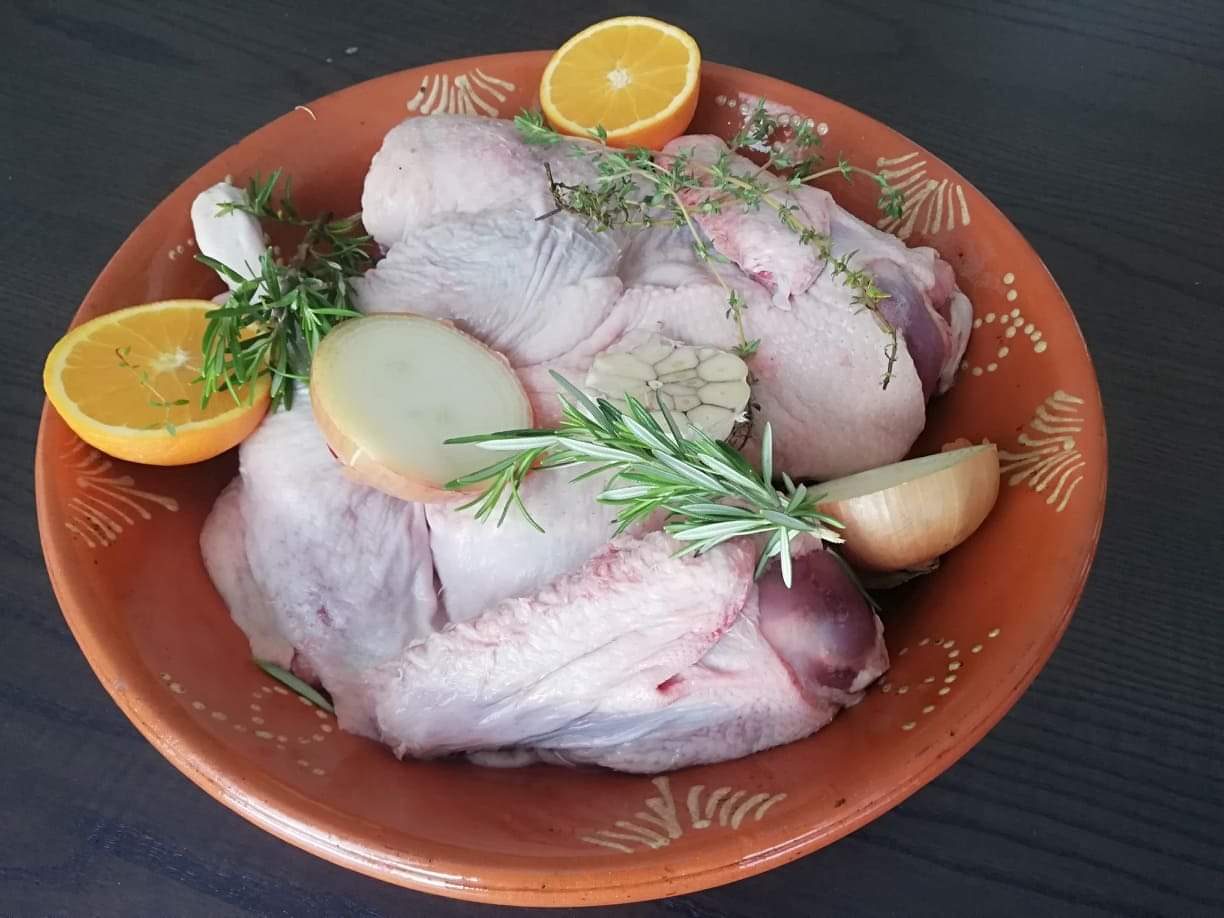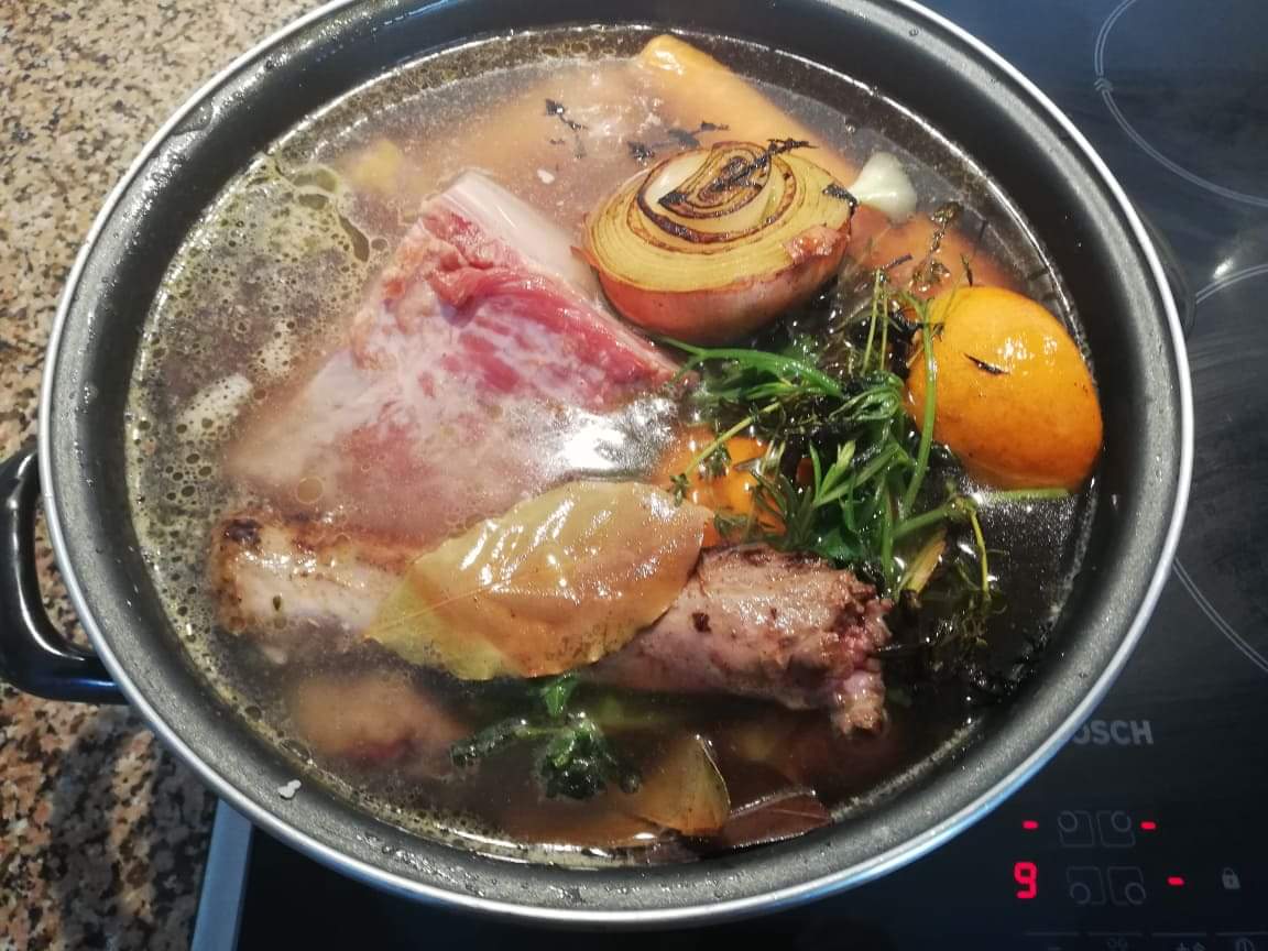 Começar por arranjar o pato. Retirar as gorduras em excesso, cortar o pato ao meio e corar bem dos dois lados com um pouco de azeite e sal grosso num tacho. Assim que estiver bem alourado, retirar o pato e no mesmo tacho adicionar a cebola, as laranjas e a cabeça de alho cortada a meio, juntamente com os restantes aromáticos. Deixar alourar bem, quase até queimar. Refrescar com vinho branco e adicionar ao pato. Colocar todo o preparado num tacho e juntar água abundante, os enchidos e a cenoura. Deixar cozinhar aproximadamente uma hora. Assim que estiver cozinhado retirar o pato, a cenoura e os enchidos, e reservar. Passar o caldo por um passador e reservar também o caldo.