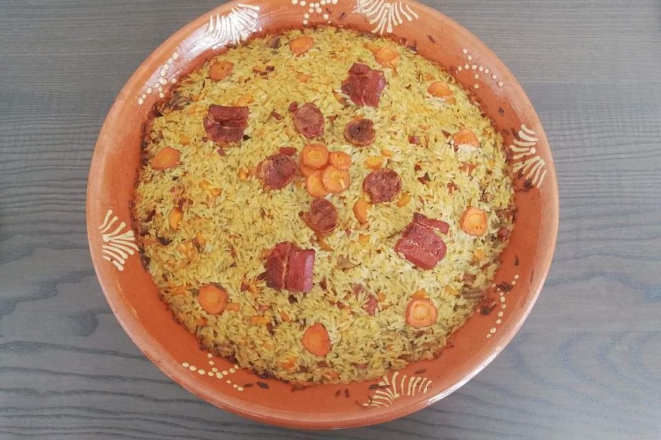 No mesmo tacho, colocar um fio de azeite, 70% da cenoura e 30% dos enchidos cortados em cubos. Deixar alourar um pouco o preparado, adicionar o arroz, envolver bem e deixar “fritar” um pouco o arroz nessa base. Em seguida, adicionar o caldo e deixar cozinhar em lume brando.