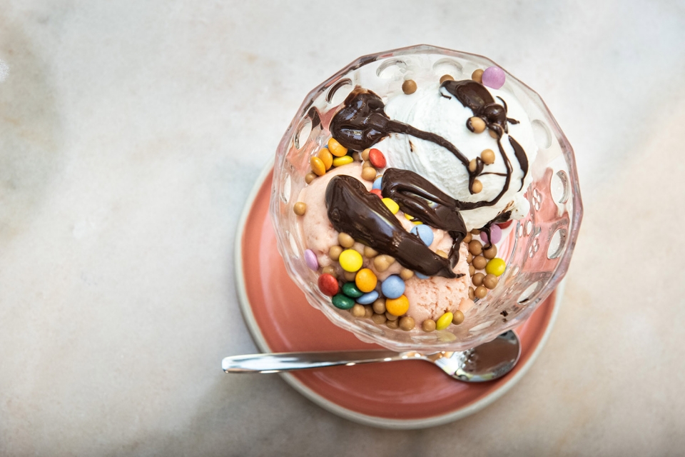 O espaço mantém as madeiras a descoberto e a decoração em tons pastel – cuja paleta de cores foi beber inspiração ao reclamo luminoso exterior, em forma de taça de gelado -, mas substituiu-se o piso acinzentado por um mais ousado, com efeito marmorite. As cadeiras originais foram pintadas e forradas e as mesas ganharam tampos de mármore.