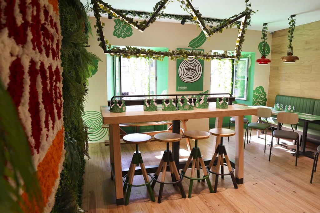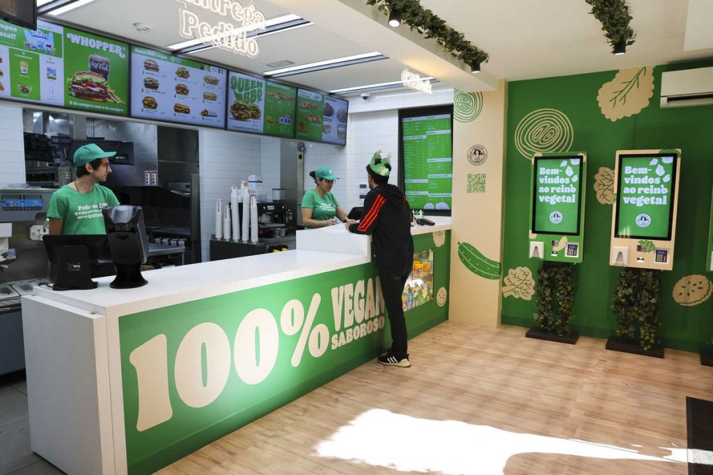 Até dia 4 de dezembro, o restaurante Burger King de Belém, em Lisboa, terá um menu exclusivamente vegan, com hambúrgueres e snacks de origem vegetal – que mimetizam a carne em sabor, textura e valor nutricional – do The Vegetarian Butcher, empresa do grupo Unilever. Para acolher esta nova oferta temporária, o restaurante de dois pisos foi redecorado em tons de branco e verde, com jardins verticais, plantas nas janelas e novos toalhetes nos tabuleiros, sacos e coroas de papel.