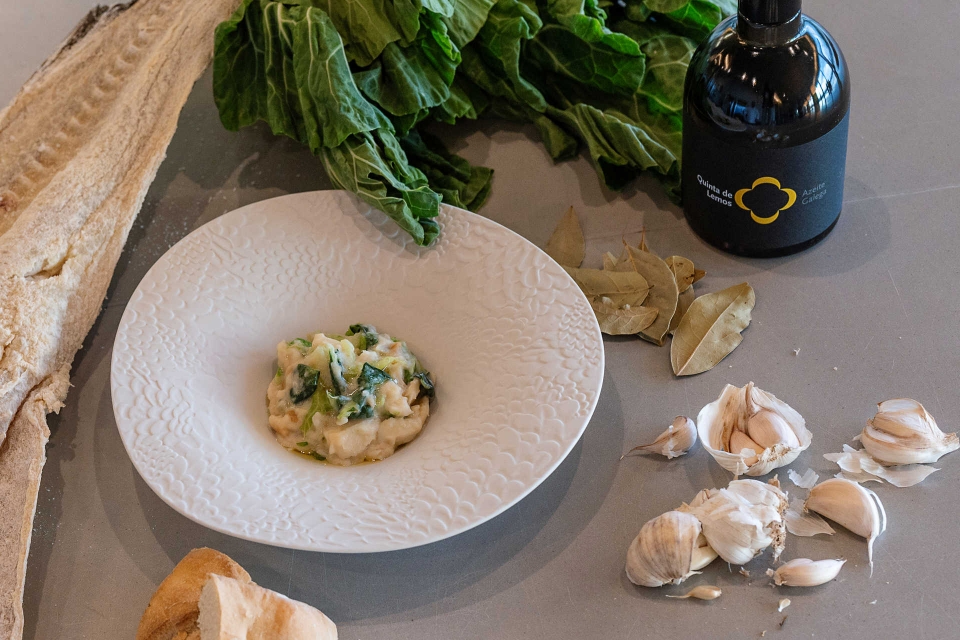 Bacalhau, couves e pão são os essenciais para a confeção desta receita, cujo segredo está precisamente em ter “bons ingredientes, porque são tão poucos”, realça o chef. A começar pelo peixe, que deve ser de cura prolongada (no mínimo 9 meses). “E a escolha de um bom azeite”, acrescenta. O toque final para dar a textura untuosa que se quer numa açorda.
