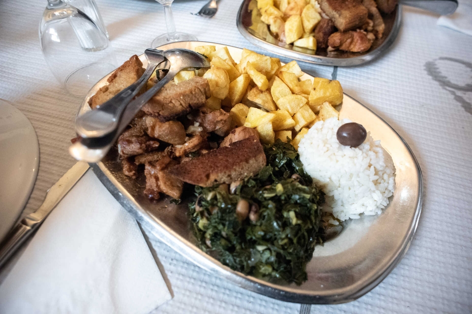 Há serviço à carta, mas é o menu de almoço que mais comensais atrai. Por 7 euros tem-se direito a sopa, pão, bebida, café e prato, sendo que durante os dias úteis há duas ou três opções. Uma de peixe está sempre garantida, seja dourada, robalo, solha ou carapau. Já os pratos de carne podem variar entre sugestões como massa à lavrador, feijoada ou frango assado. Este último é um sucesso e esgota sempre, havendo quem chegue ao restaurante às 11.30 horas para garantir o prato, conta entre sorrisos Rafael Cerqueira da Cunha, proprietário.
