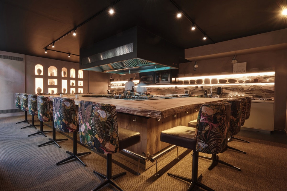 Do balcão de madeira em u, assiste-se a toda a preparação e empratamento, o que amplia a noção interativa destes jantares. A viagem inicia-se com um waffle fermentado com creme fraîche, caviar e cebolinho; segue para a enguia fumada e ensanduichada em texturas de beterraba e chilli; partindo-se depois para a gamba roxa algarvia com leitelho, funcho e gel de limão. O mar continua a dar cartas com o lírio dos Açores curado a seis horas com molho de ostra fumada, guacamole e ovas de truta; o lagostim algarvio com puré de cenoura assada e cantarelos de Bragança; e a raia de Aveiro curada com pil-pil de sames de bacalhau.