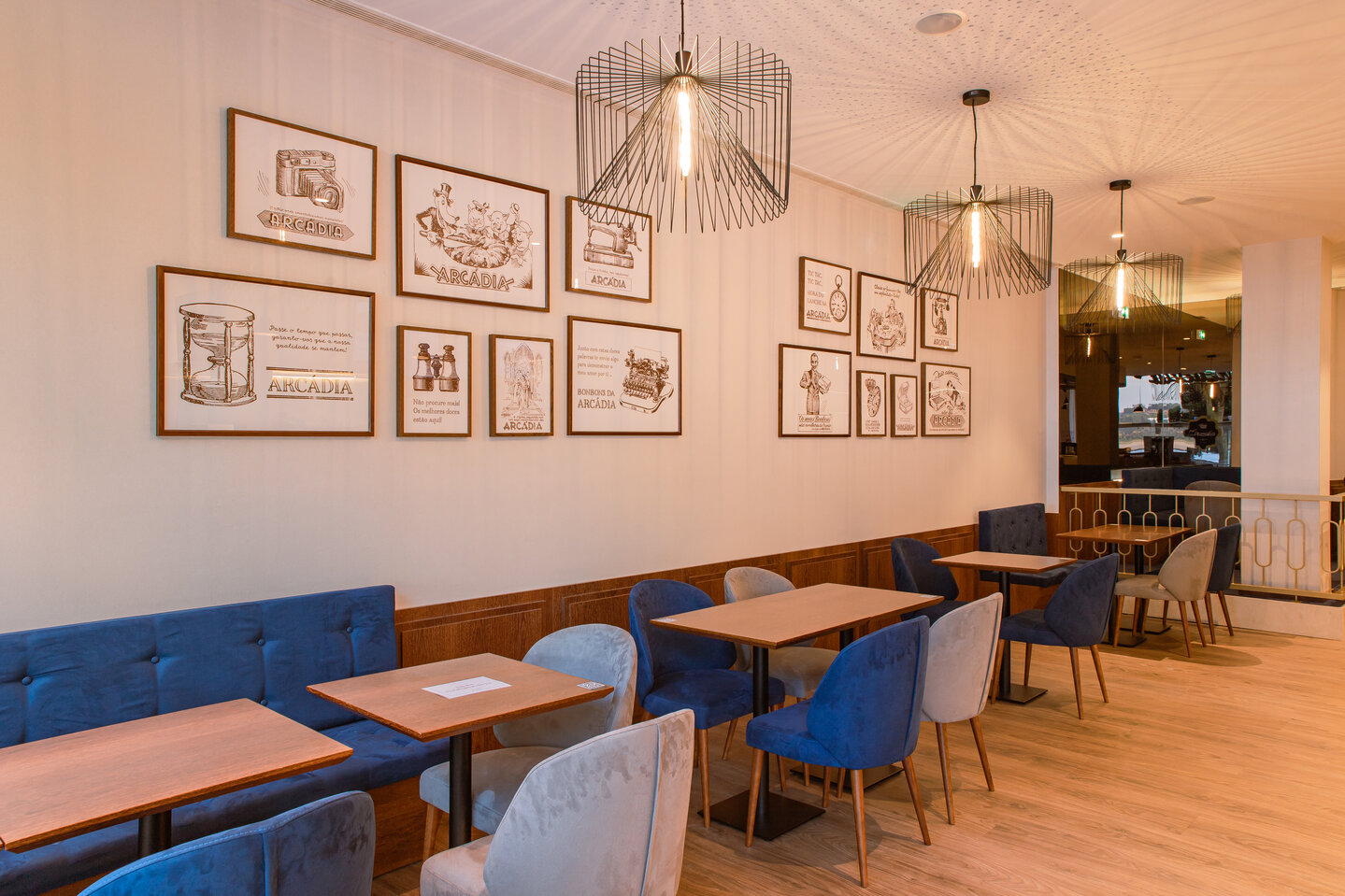 À semelhança de outras lojas Arcádia, recorreu-se a tom azul da insígnia em diversos apontamentos, e privilegiou-se o uso da madeira para dar elegância e conforto à sala, onde se sentam várias pessoas, e foi criado um corner independente para a loja de chocolates. No exterior, sobressai a esplanada com vista para a foz do Rio Douro.