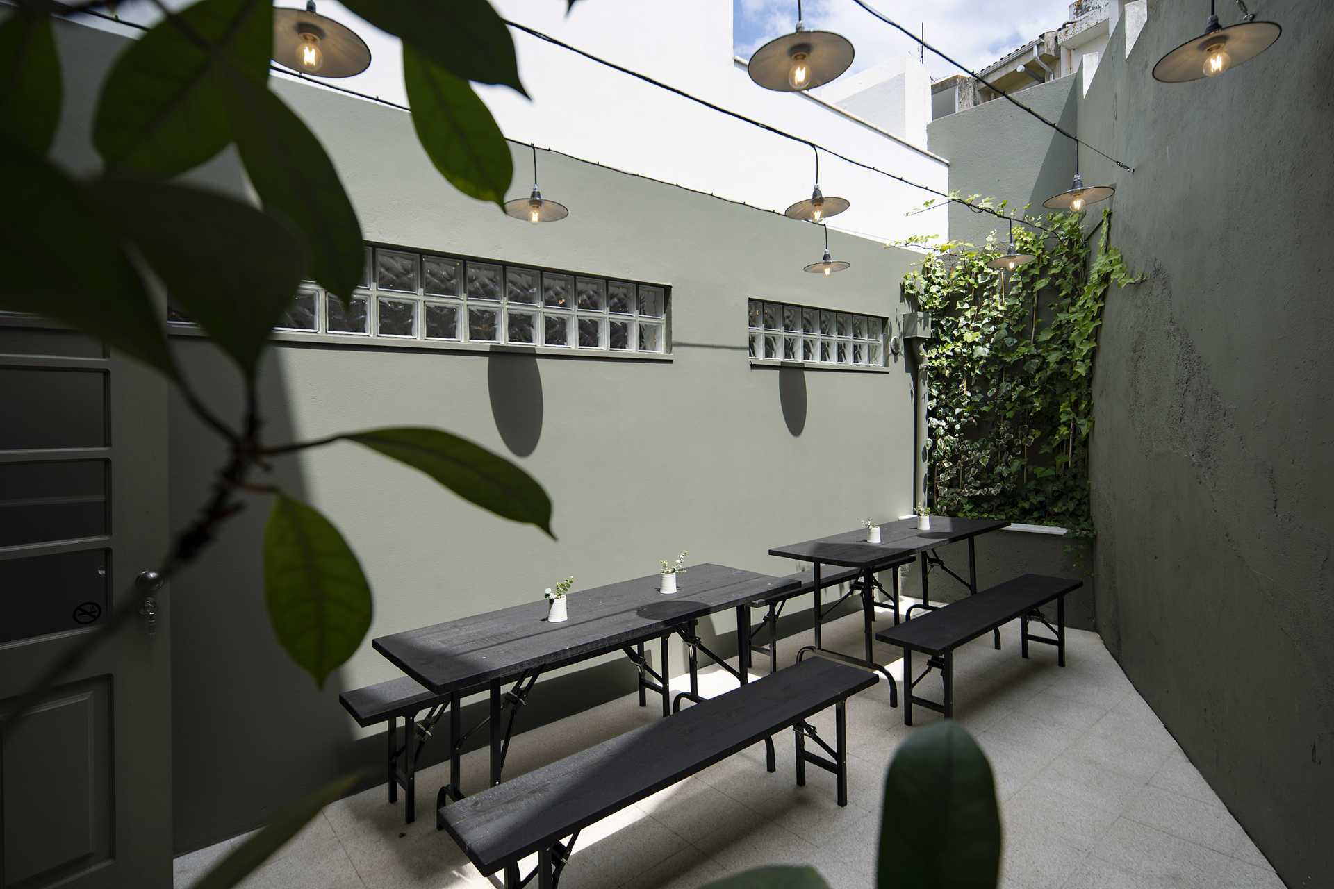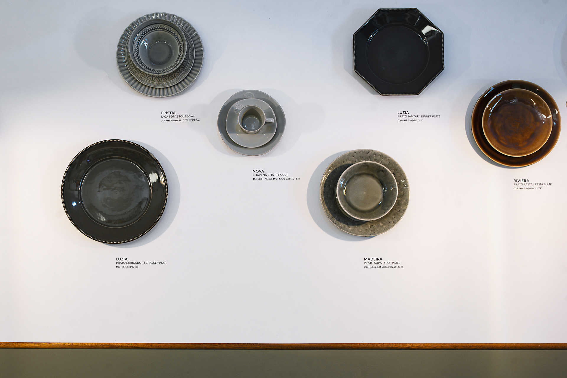 Ao fundo da sala, encontra-se uma espécie de catálogo da marca Costa Nova, com pratos das várias coleções exibidos na parede. Vêm complementar a decoração de traço contemporâneo e o ambiente luminoso do espaço. E nas traseiras, abre-se ainda uma pequena esplanada, ideal para quem procura uma refeição mais intimista, ou aproveitar as noites de verão ao ar livre.
