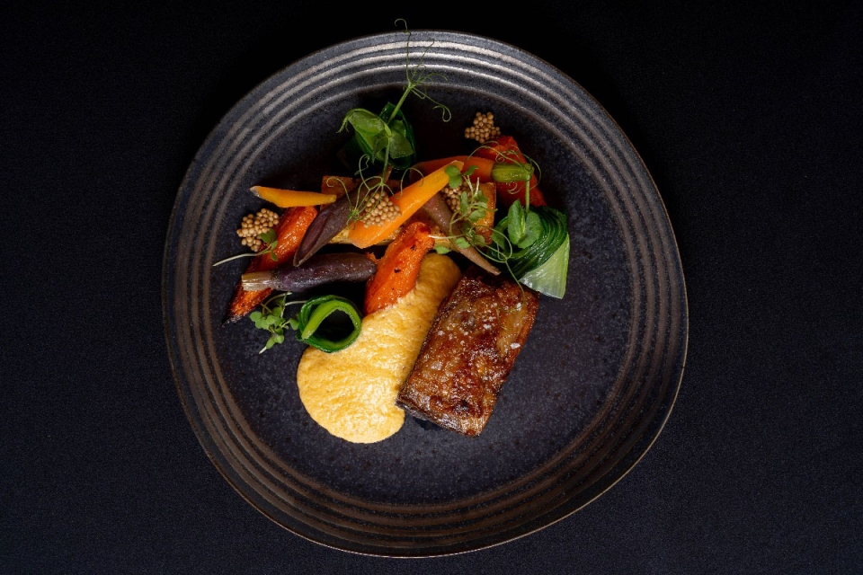 Trava-se conhecimento, na carne, com o vitelão: naco generoso, de longa gestação e reconfortante, num coro de gulodice com gratin de batata e mostarda, cheddar vintage, cenouras baby, batata-doce laranja e pak choi.