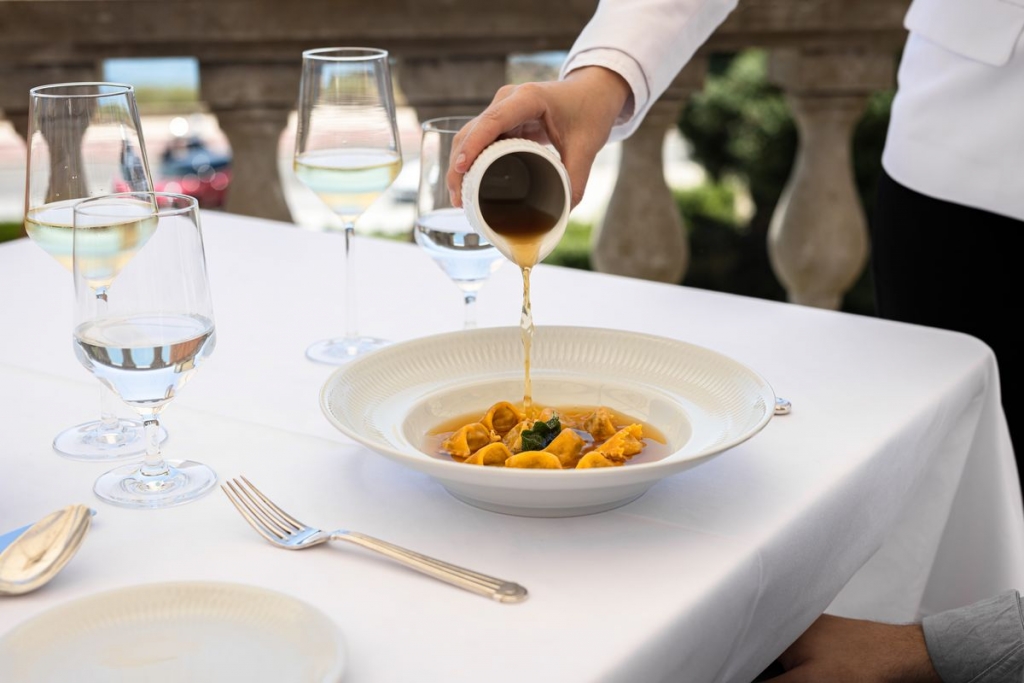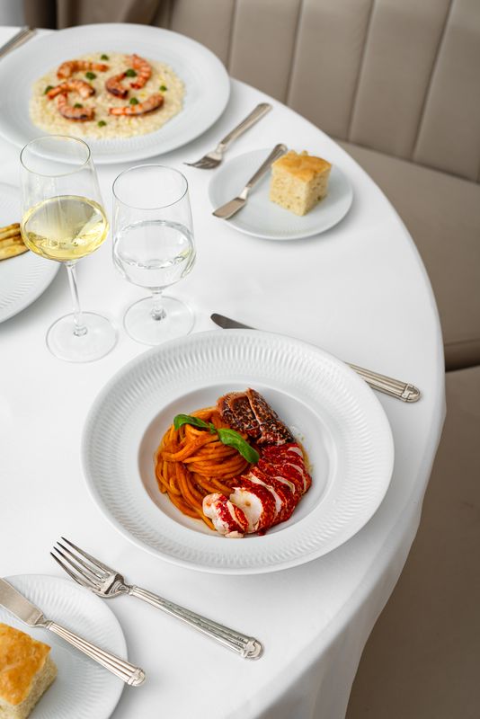 Elegante e atento ao detalhe, o serviço de sala transporta da cozinha uma série de pratos que vale a pena provar, como as entradas fritto misto (vegetais, peixe e carne envoltos em polme e fritos até ficarem crocantes) e o atum tonnado, uma espécie de tataki com alcaparras, verduras e vinagre de limão. Nos principais, quase dispensa descrições o paccheri al pomodoro – massa coberta com molho de tomate e queijo parmesão -, que a finalização no carrinho junto da mesa ajuda a abrilhantar. Também há risotos, pratos de peixe e de carne, alguns ideais para partilhar.