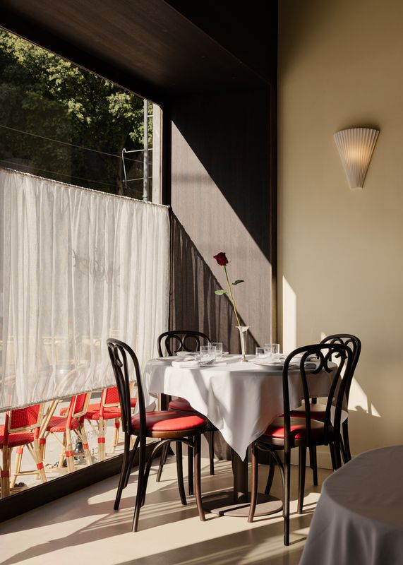 A cortina de veludo encarnado dá um enquadramento teatral ao balcão saliente da cozinha do Bisque, enquanto os cozinheiros se desdobram nas confeções e empratamentos ancorados no homónimo molho francês, geralmente feito à base de caldo de marisco. Idealizado pelo estúdio criativo Centá, responsável por eventos e decoração de espaços, entre Paris e Lisboa, o “teatro gastronómico” mistura várias escolas, épocas e estilos que em conjunto resultam na estética do típico bistrô parisiense, com velas, arranjos de rosas barrocos e as cadeiras de madeira escura.