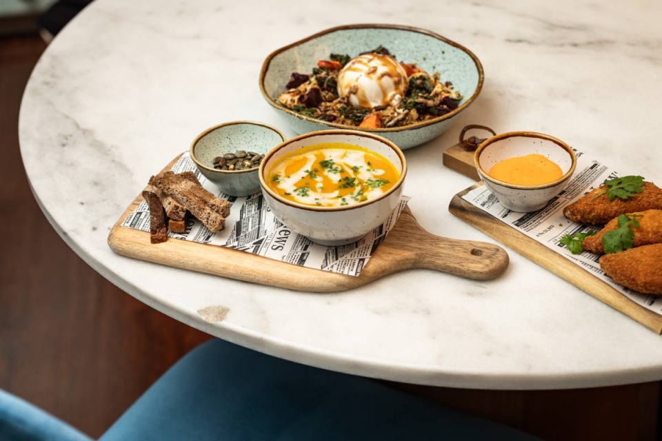 Quem não dispensar uma sobremesa pode agora escolher entre um cheesecake de abóbora e frutos secos e um crumble vegano de maçã e canela. Fora do horário das refeições (o almoço é servido das 12h30 às 15h e o jantar das 19h às 22h30), os hóspedes e visitantes externos ao hotel podem visitar o terraço do hotel. Já no Hangout Bar, uma sala com lareira, há cocktails com música. A animação acontece das 18h30 às 20h30 nos dias 19 de março (banda Vintage Trio), 21 (banda Racorr Duo), 26 (DJ Higor) e 28 de março (DJ Tiago Tocha).